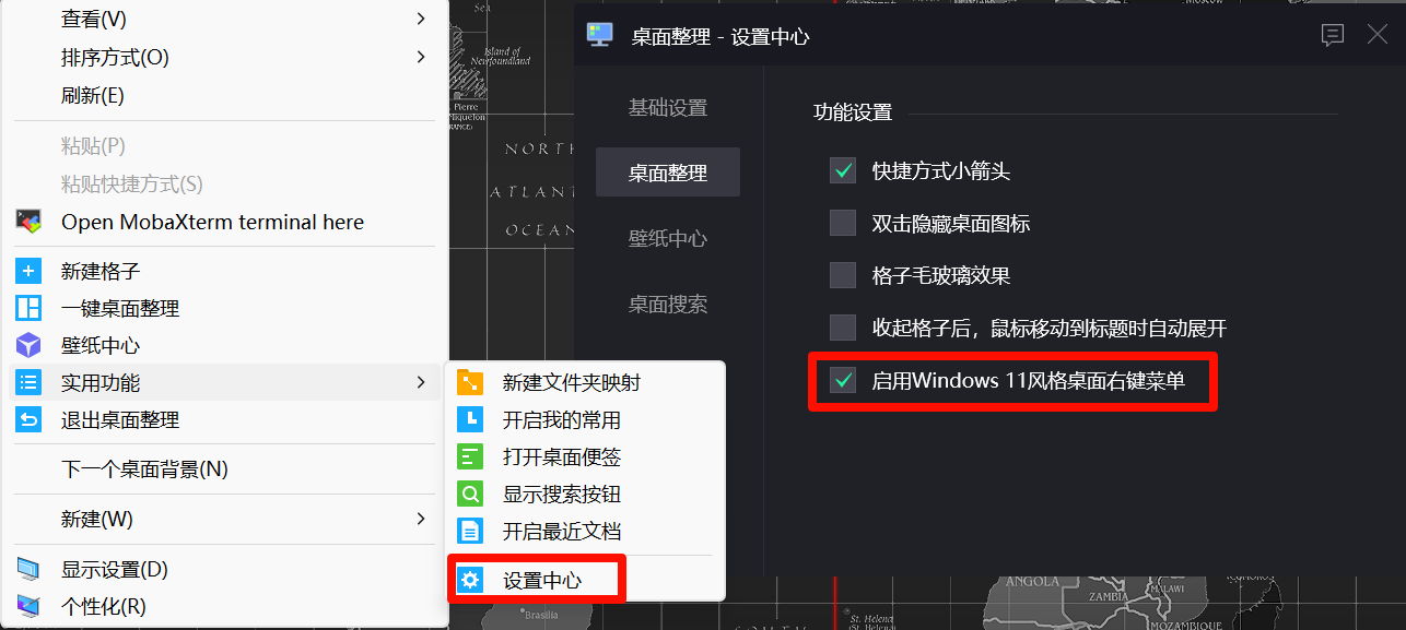 这个桌面插件在 “实用功能” → “设置中心” 里面居然还有一个 “启用Windows11风格桌面右键菜单”,只要把这个选项去掉,Win11 右键菜单恢复成 Win10 状态就立马生效了。