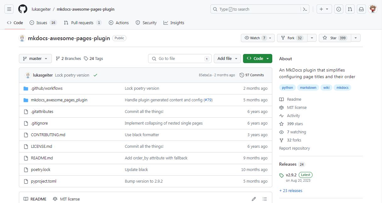 反而是 MkDocs Awesome Pages Plugin 一直保持着非常积极的更新频率,而且维护者和关注和使用用户也远远比 mkdocs_include_dir_to_nav 多得多。