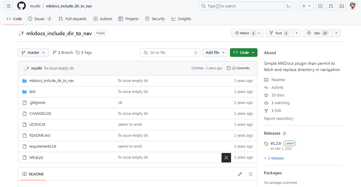 从 GitHub 可以很直观看到的是 mkdocs_include_dir_to_nav 自从 2022-05-01 更新了 V1.2.0 版本后基本就已经停止了更新,Star 也才 20 多人。