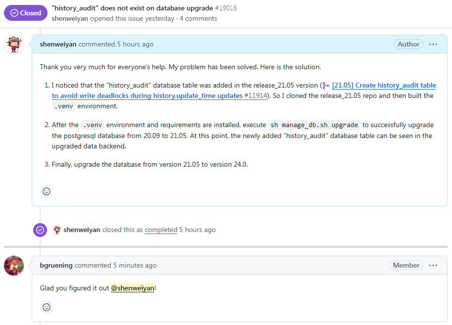 由于 Galaxy 在 release_21.05 新增加了一个 history_audit 数据表,release_20.09 的数据库直接执行 sh manage_db.sh upgrade 升级的时候 history_audit 数据表并不会一并创建和更新,因此最终导致在 Galaxy 服务启动的时候发生错误。