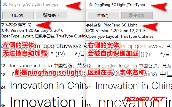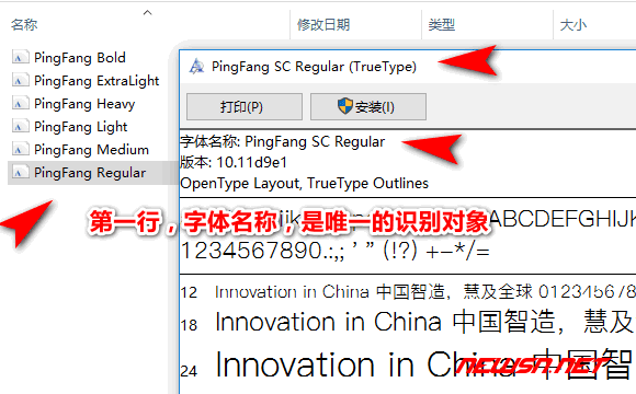 注意:萍方/苹方,在安装的时候,文件名也都是 pingfang-sc 之类的文件名。但是,安装完成的真正成品,可不是这个拼音名字。进而导致字体不能识别。![]()