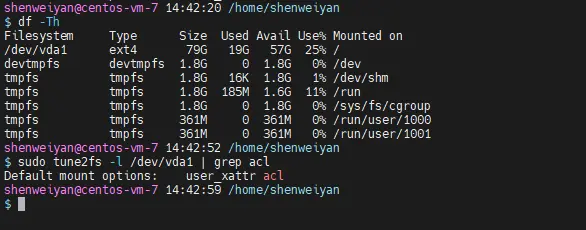 通过上边的输出可以发现,默认的挂载项目中已经对 ACL 进行了支持。如果发现结果不如所愿,你可以通过以下命令对指定分区(此例中使用 /dev/sda3)开启 ACL 的支持)。